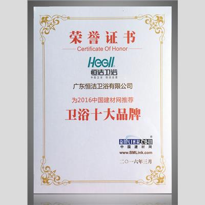 獎 項:2016中國建材網推薦 衛浴十大品牌