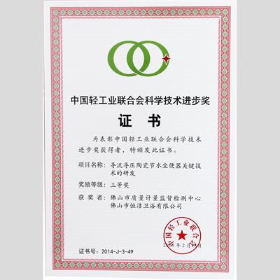 獎 項:中國輕工業聯合會科學技術進步獎(項目名稱:導流導壓陶瓷節水坐便器關鍵技術的研發)