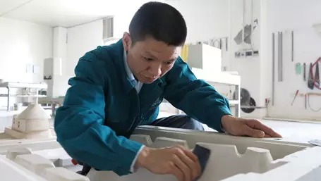 楊建強是恒潔衛浴產品研發中心陶瓷模具開發技術師傅,今年42歲的他在恒潔已經工作了12年。作為資深的技術師傅,陶瓷模具的制作在他眼里,已經不僅是一門手藝活,更是一件需要自己用心去打磨、雕琢的作品。