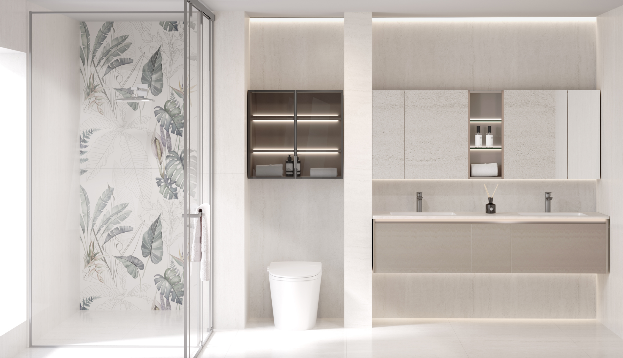 整體風格簡約現代,滿足多口之家使用需求。增加收納空間及合理分區,綜合考量每位家庭成員需求,定制安全、舒適、溫暖的衛浴環境,提升全家人的生活幸福感。